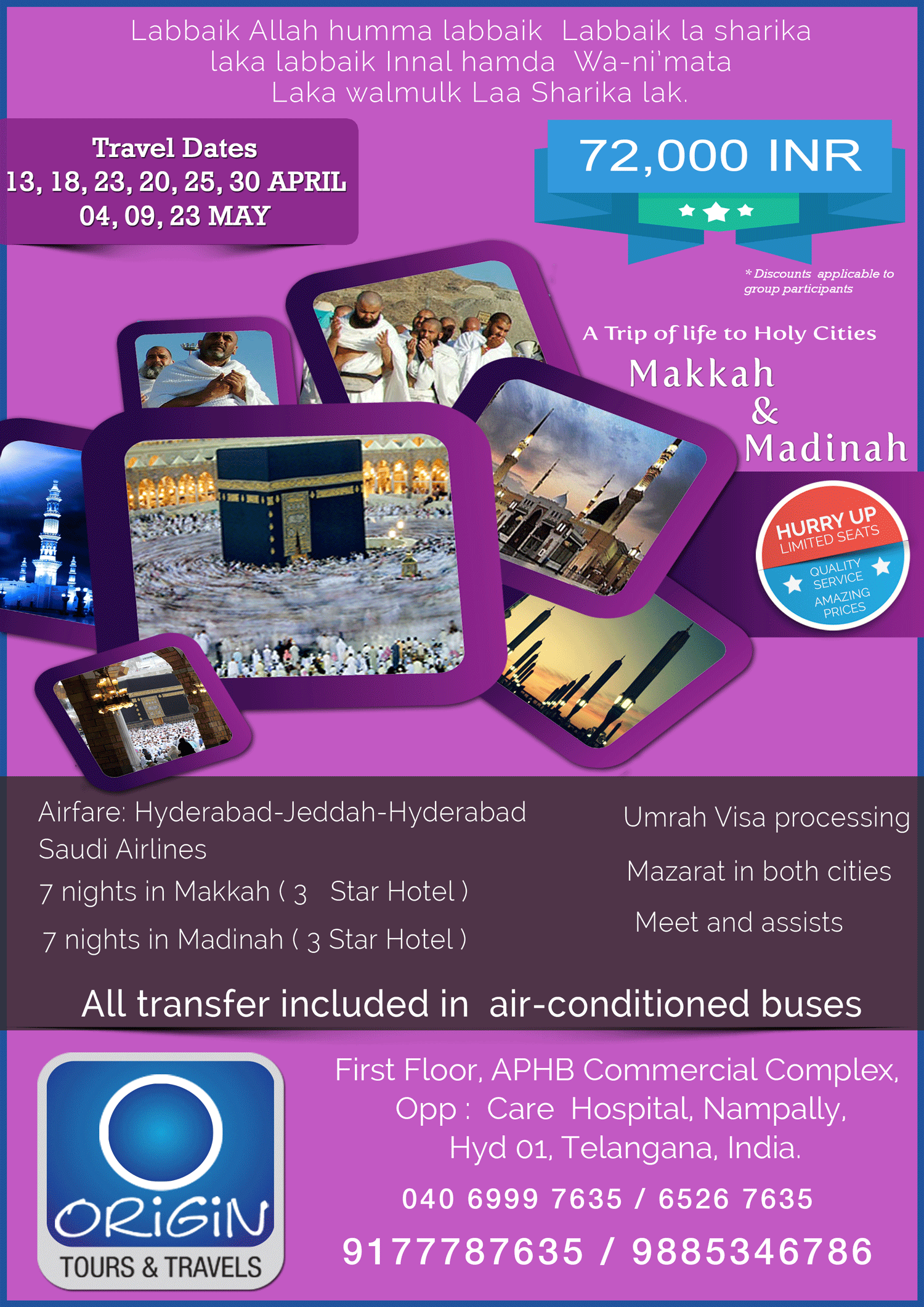 Tours Origin Groups is dedicated to provide exclusive Hajj & Umrah services to the best quality and price and ensure your holy trip is worry free with specially arranged care free airport to airport facilitating packages; we are there for your service round the clock Tours Origin Groups philosophy is to maintain the highest standards in personalized customer service with our professional experience. We are dedicated to continuing to be a valuable resource to our clients by delivering convenience, comfort and cost saving.